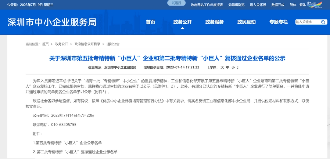 2023年7月,深圳(zhen)市中小(xiao)企業服務(wu)局發布消息(xi),近日工業和信息(xi)化部(bu)開展了第五(wu)批專精特新(xin)“小(xiao)巨(ju)人(ren)”企業培育工作,已(yi)完成(cheng)相(xiang)關審核。根據公示名單,深圳(zhen)共有310家企業通過(guo)審核,唯特偶榮列其中!